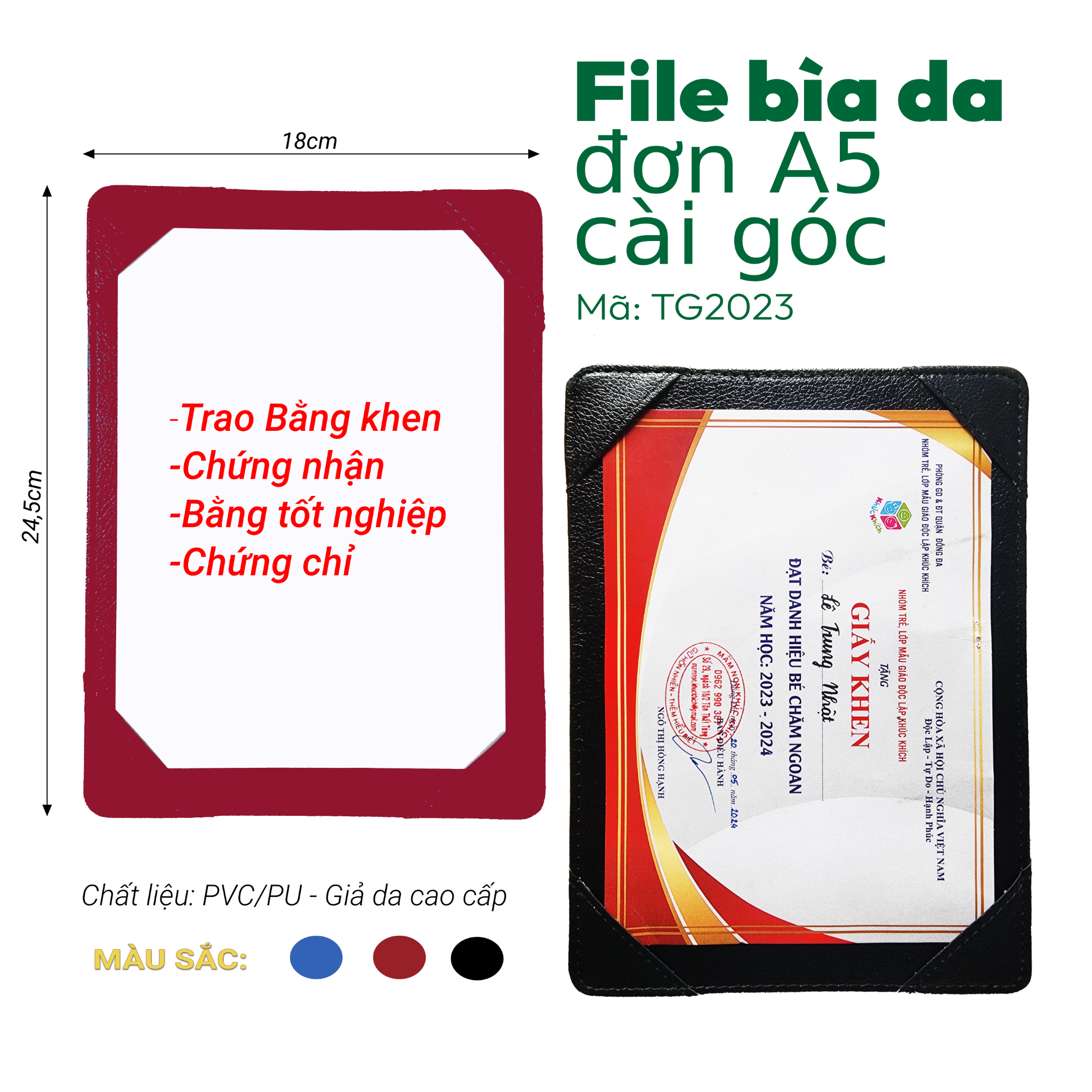 [MẪU 2025] File Bìa Da Đơn A5 Cài Góc TG2023 - Kích thước: 18x24,5cm - Sử dụng trong Hội Nghị, Trao Giải/Chứng Nhận/Chứng Chỉ/Bằng Khen/Bằng Tốt Nghiệp