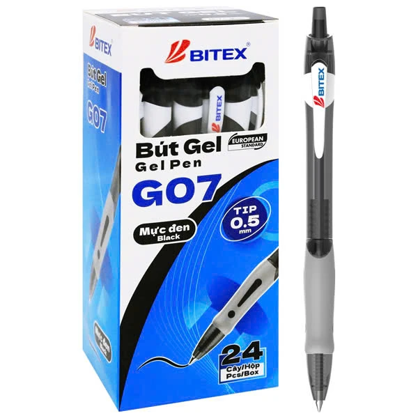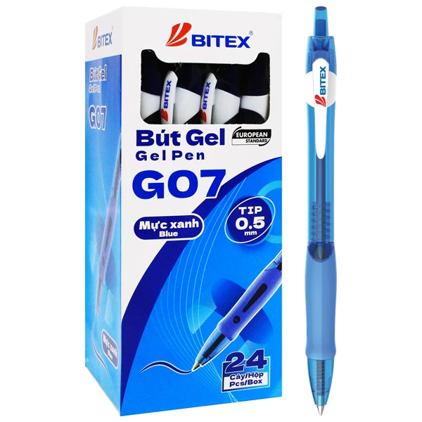 Bút Gel Bitex G07 Ngòi 0.5mm - Mực Xanh, Đen với thiết kế nổi bật, đẹp mắt, mang lại trải nghiệm viết mượt mà và giảm mỏi tay khi viết nhiều. Dành cho học sinh, sinh viên và người làm văn phòng.
