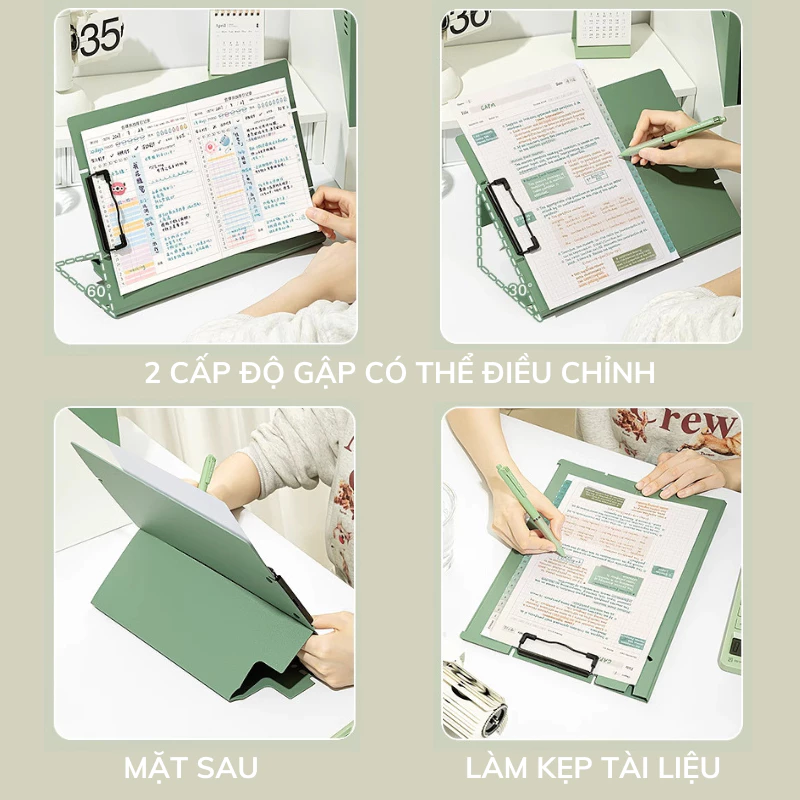 - Mặt sau có thể gập lại cài vào mặt trước tạo thành đế đỡ 2 góc độ 30 độ và 60 độ tùy chỉnh để phù hợp với tư thế và vị trí làm việc