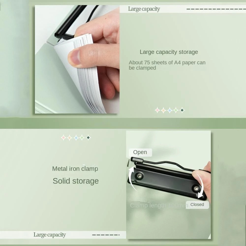 - Sản phẩm có khoá kẹp chắc chắn, trơn tru, được làm từ thép không gỉ kết hợp sơn tĩnh điện, độ bền được kiểm nghiệm, đặc biệt lò xo rất linh hoạt, dễ dàng thao tác đóng mở khi cho thêm hoặc lấy giấy ra