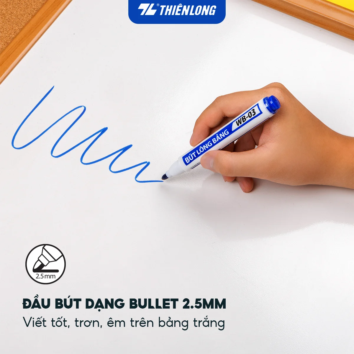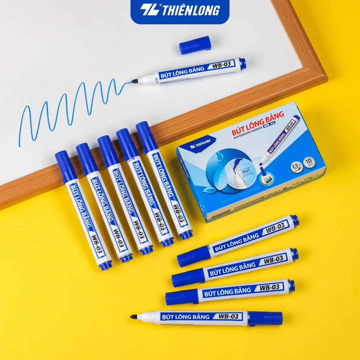 Bút viết bảng Thiên Long WB-03 sử dụng mực mới, tốt, màu mức đậm, tươi sáng, dễ dàng xóa sạch ngay cả khi viết trên bảng lâu và không để lại bóng mực sau khi lau bảng và các bề mặt nhẵn bóng.