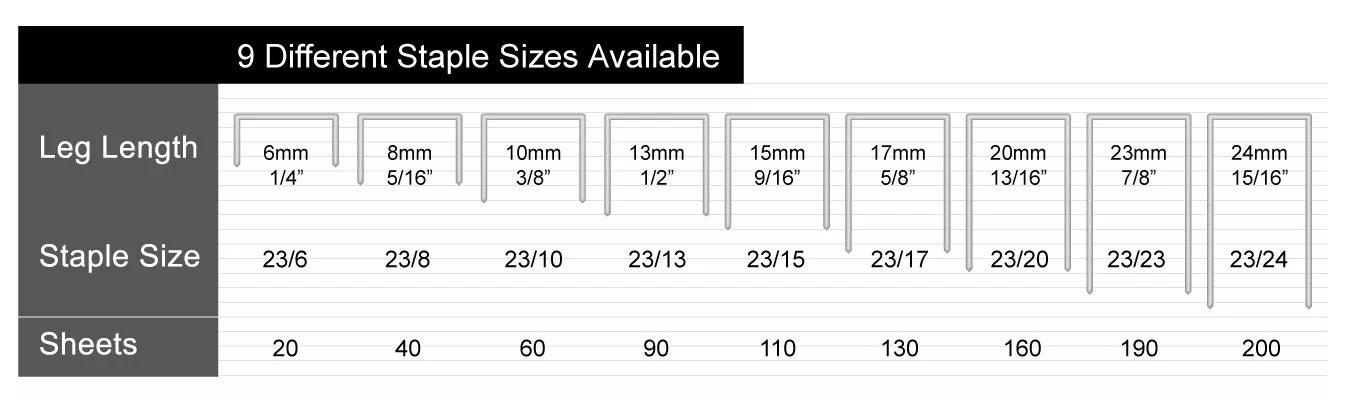 • Loại kim tương thích: Sử dụng các loại kim bấm lớn dòng 23/, từ 23/6 đến 23/24 (tùy độ dày giấy).