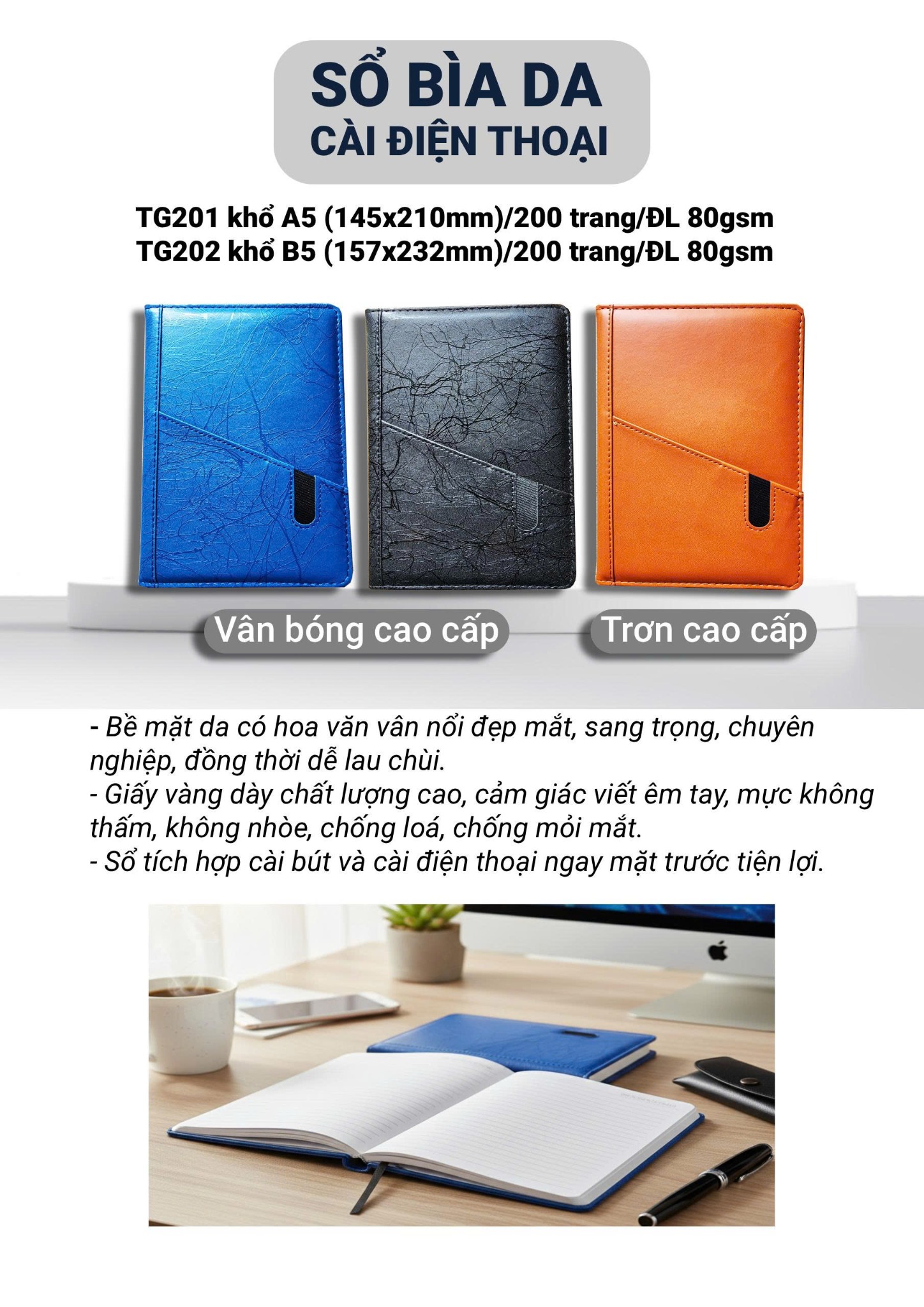 Chất liệu bìaGiả Da cao cấp, bề mặt vân nổi/vân bóng sang trọng, chống bám bẩn – dễ lau chùi