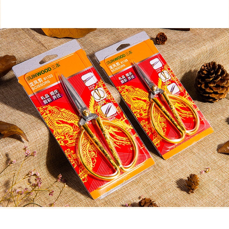 Kéo rồng Sunwood 91121 thiết kế nổi bật với phần tay cầm mạ đồng sang trọng, khắc hình rồng và phụng tinh xảo, độc đáo.
