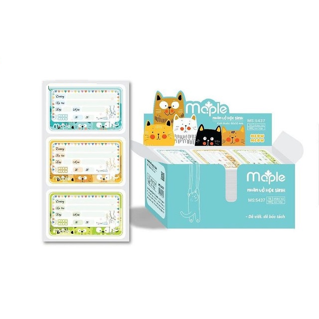 Nhãn vở Maple MEOW 5436 - 15 nhãn/túi với thiết kế decal có keo dán sẵn, chỉ cần bóc và dán, không cần dùng keo/hồ.