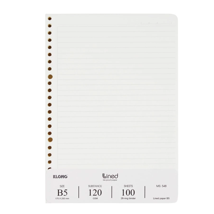 Ruột sổ còng kẻ ngang khổ B5 KLONG 548 được in offset sắc nét trên giấy có độ trắng kem tự nhiên (76% ISO) không gây mỏi mắt khi đọc, viết; độ dày giấy cao (120 g/m²) có thể viết, vẽ được với tất cả các loại mực, màu gốc nước mà không bị thấm, lem nhòe;