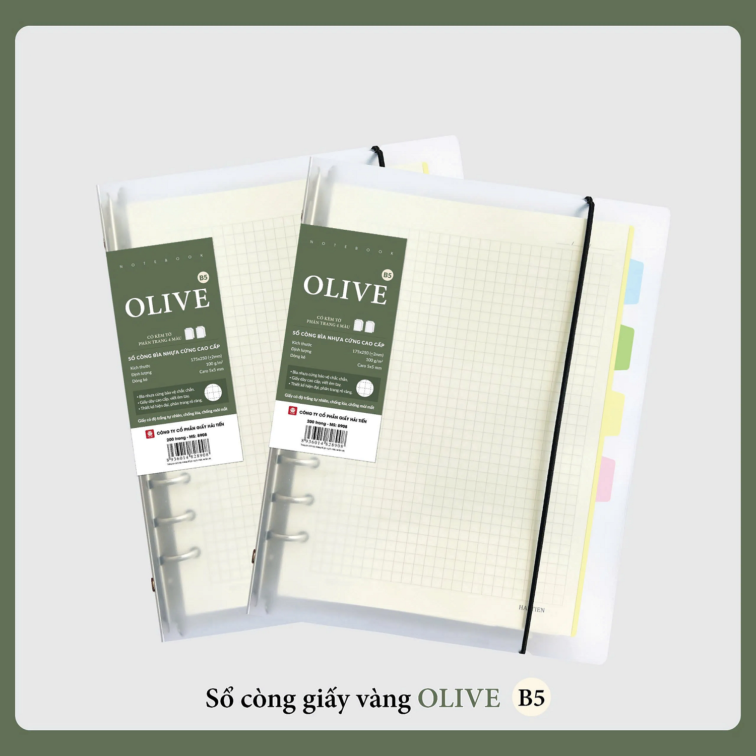 Sổ còng bìa nhựa OLIVE 200 trang 8908 khổ B5 - Dòng kẻ Caro, kèm 4 tờ phân trang