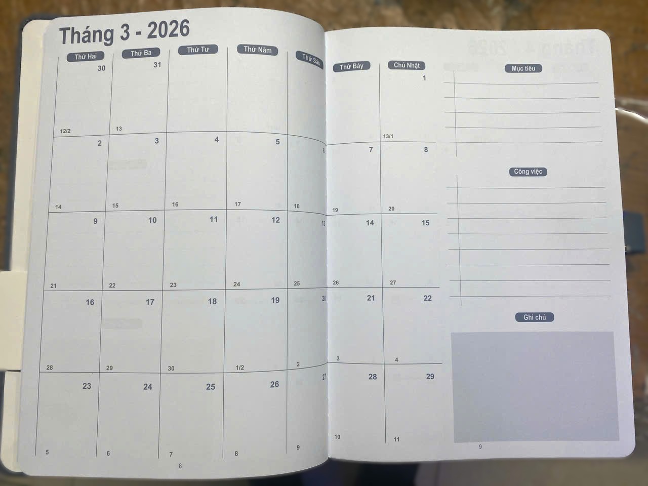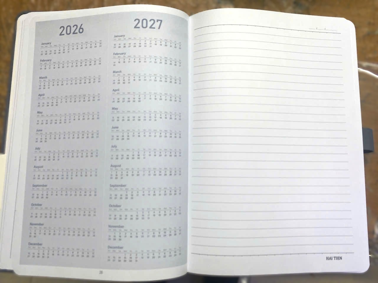 - Sổ có 24 trang đầu là lịch năm 2026, các trang còn lại là giấy trắng dòng kẻ ngang.
