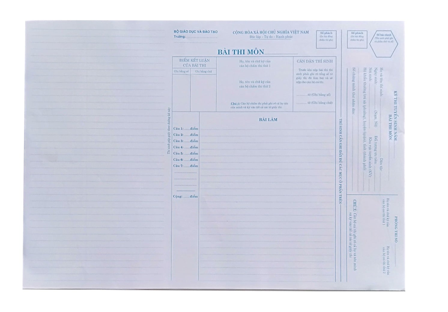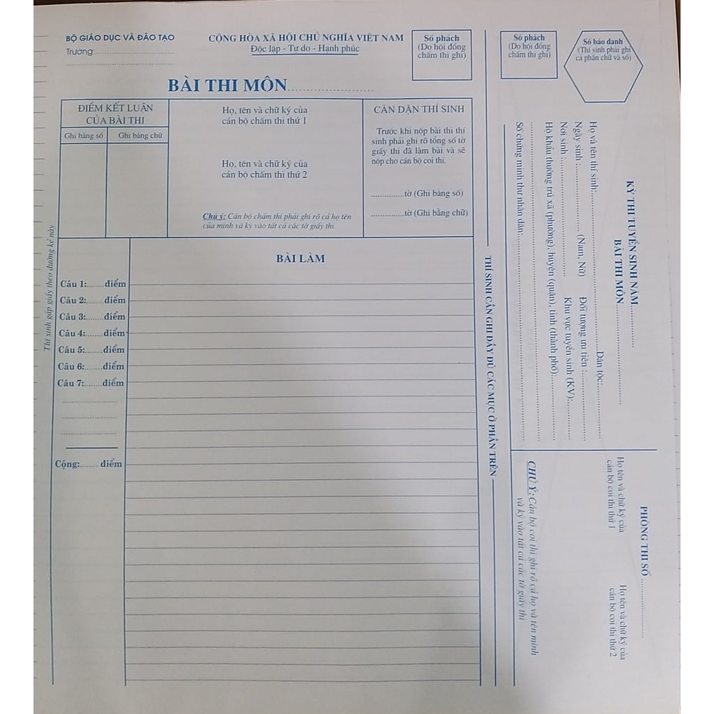 Giấy thi A3 mẫu Bộ GD&ĐT Hà Nội là mẫu giấy dùng để thi tự luận cho các thí sinh.